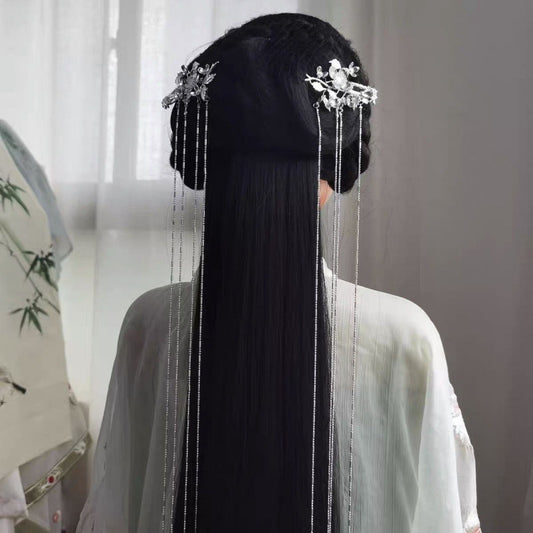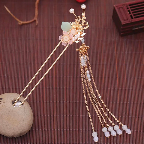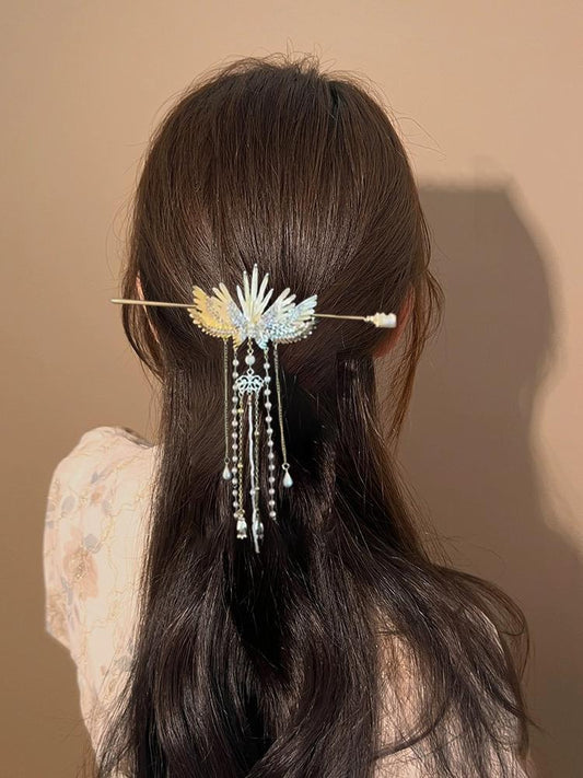 The hairpin is an ancient hair accessory and a crystallization of wisdom among the Han Chinese people in ancient China. It's typically crafted from materials such as metal, bone, or jade, presenting various shapes, some elongated, others crescent-shaped, and even resembling flowers. The length and thickness of hairpins also vary across different eras and regions.
