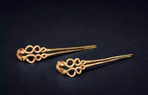 By the Xia, Shang, and Zhou periods, numerous types of hairpins had emerged, ranging from those made of gold and jade to those crafted from wood. Gold hairpins were the most common, often featuring a conical or horseshoe-shaped design, primarily adorning the hairstyles of noblewomen.