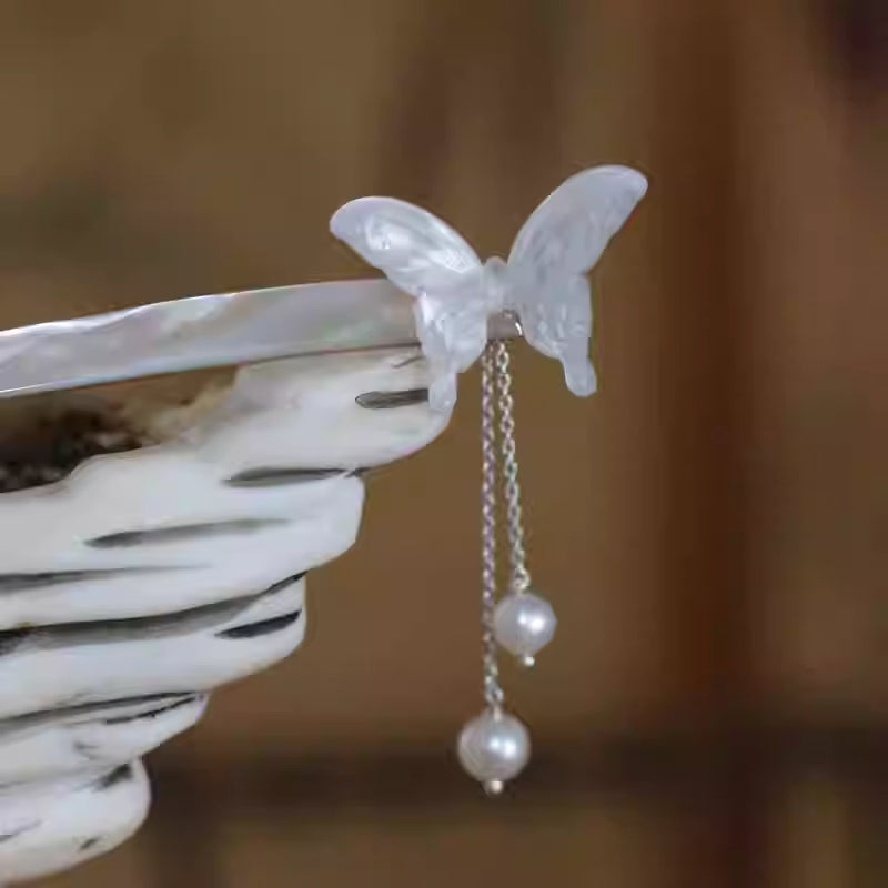 This delicate butterfly hairpin features natural shell and luminous pearls, with elegant flowing tassels. Measuring approximately 18 cm (7.1 in) in length, it combines classical Chinese aesthetics with a fresh and minimalist style, making it perfect for Hanfu, traditional Qipao, weddings, cultural events, or daily wear.