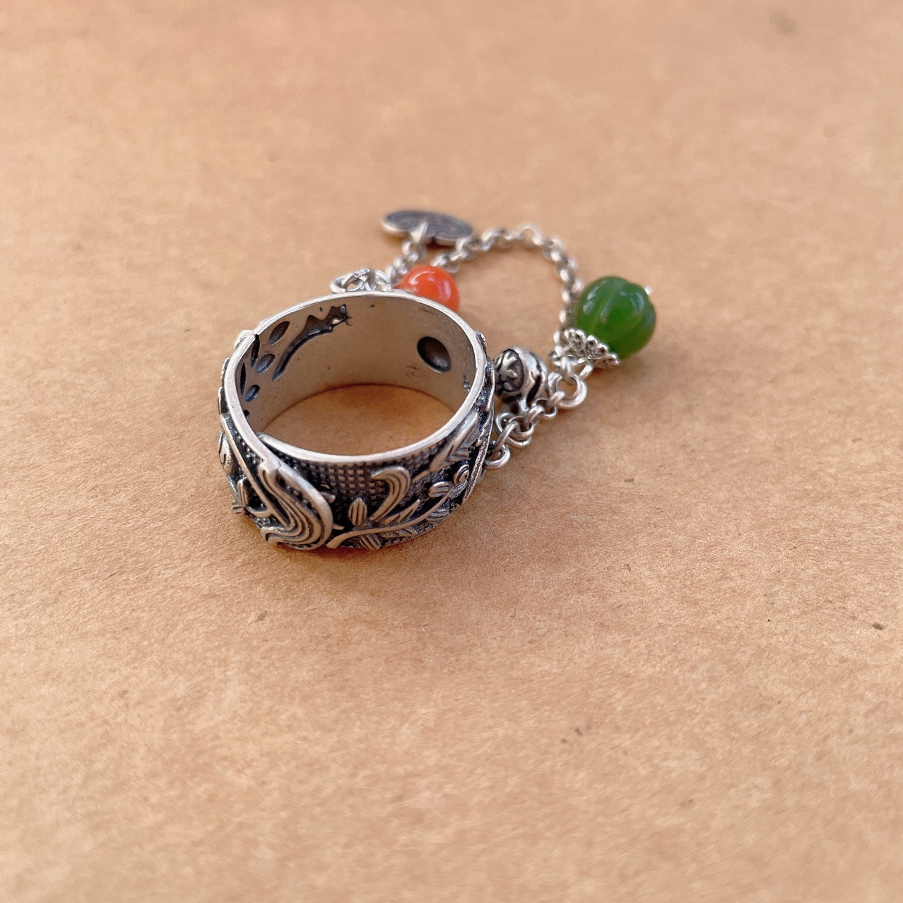 Peony Flower Jasper Tassel Vintage Ethnic Style Ring-Sterling Silver