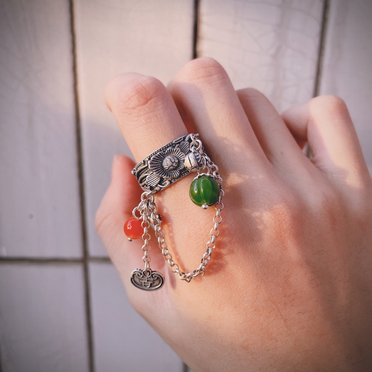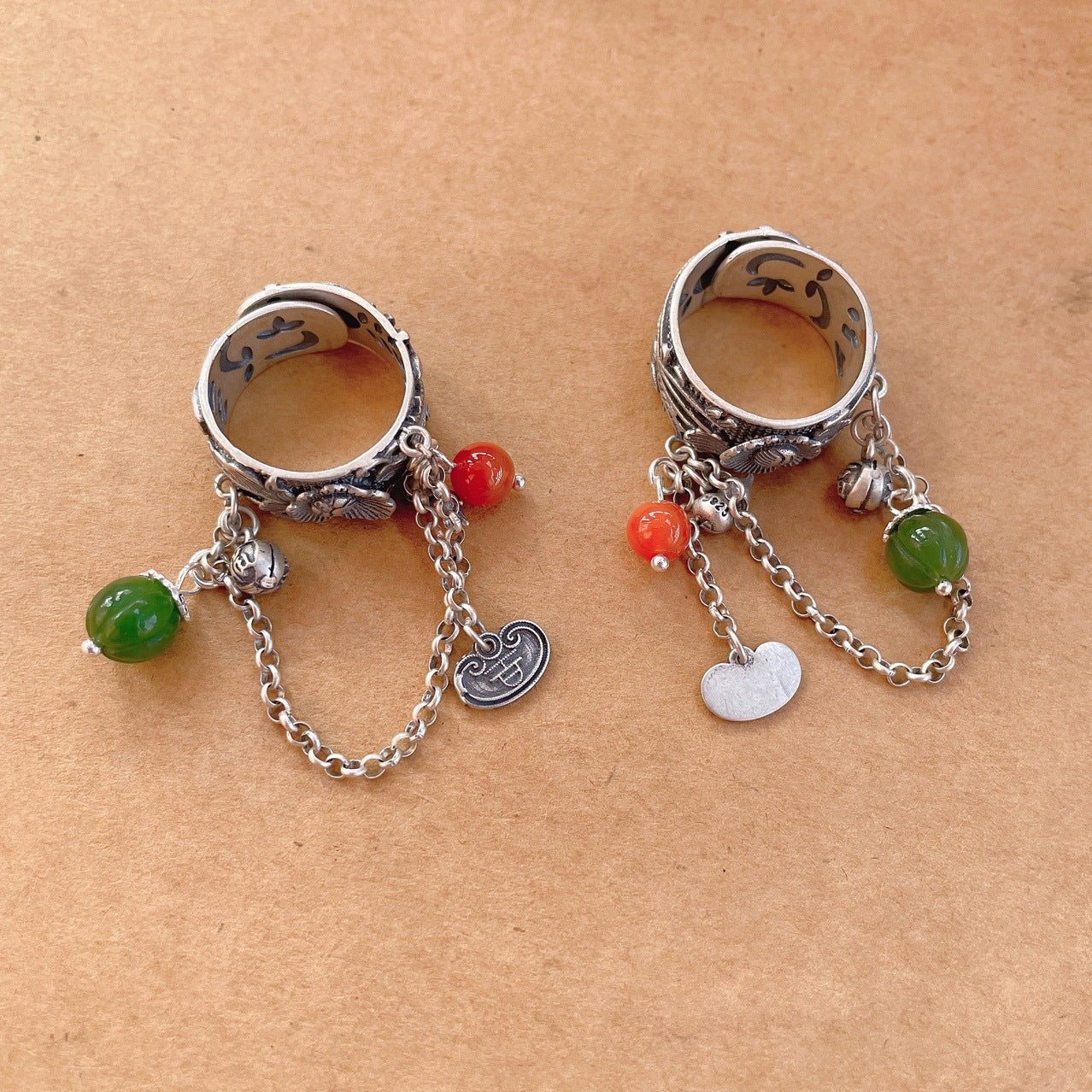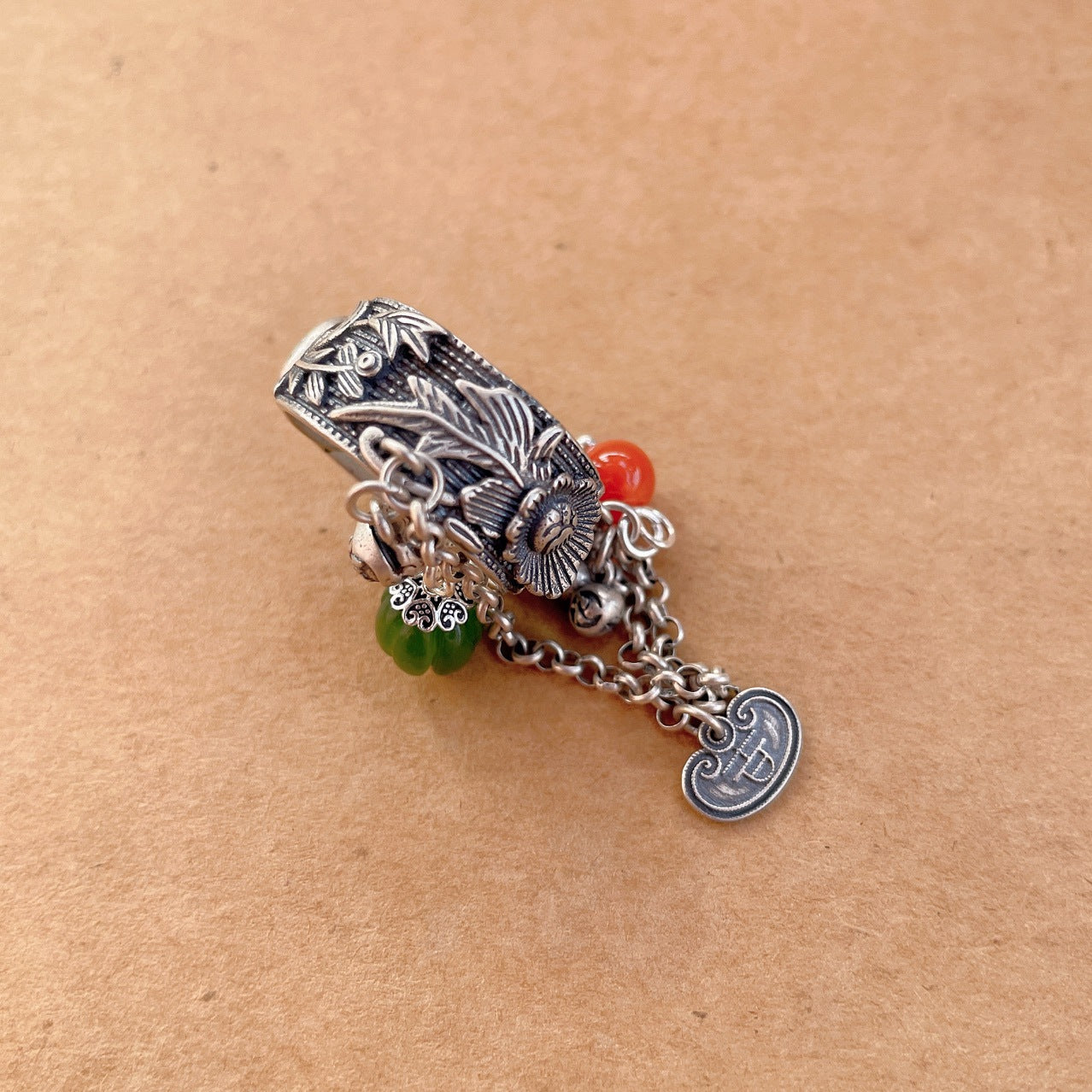 The tassel detail on the ring adds a touch of elegance and sophistication. Tassels have been used in various cultures as decorative elements, and they often symbolize prosperity, longevity, and good luck. The flowing movement of the tassel can also represent freedom and energy.