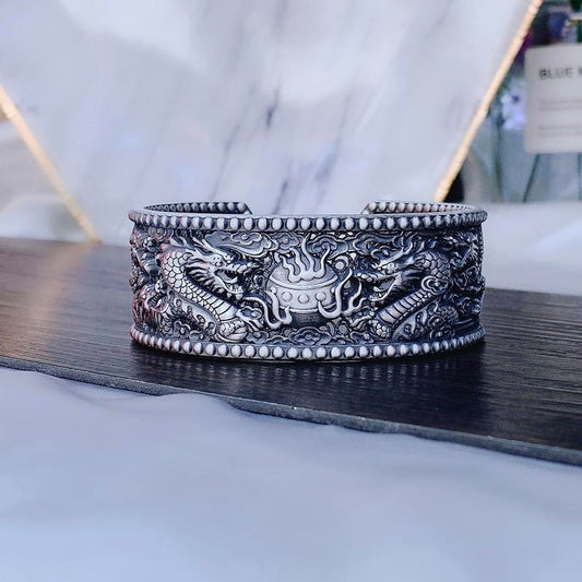 Double Dragons Playing with Beads hollow out Open Bracelet - Sterling Silver