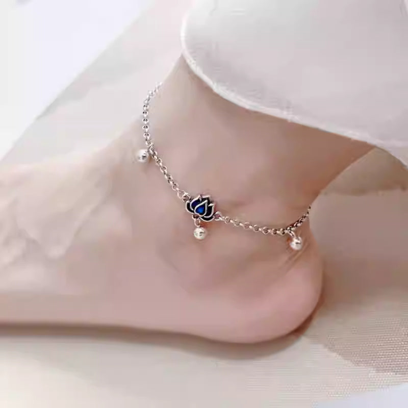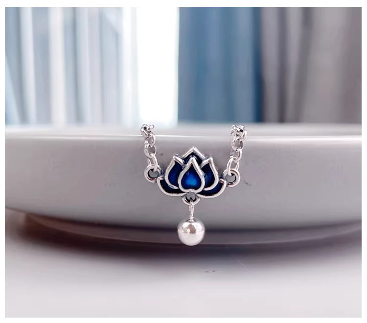 Elevate your style with this S925 sterling silver blue lotus anklet, featuring a delicate bell and handcrafted vintage-inspired design. The anklet combines 925 sterling silver with exquisite flame-blue (烧蓝) craftsmanship, giving it a soft, elegant sheen that catches the light beautifully.
