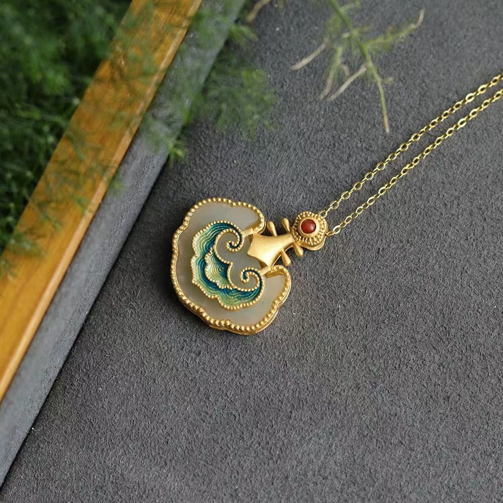 The Pipa Ruyi Enamel Hotan Jade Pendant is a unique and exquisite piece of jewelry that showcases the fusion of traditional Chinese craftsmanship and the natural beauty of Hotan Jade. This pendant features a combination of a pipa-shaped design, the auspicious Ruyi motif, and the elegance of enamel work, all set in the backdrop of Hotan Jade.