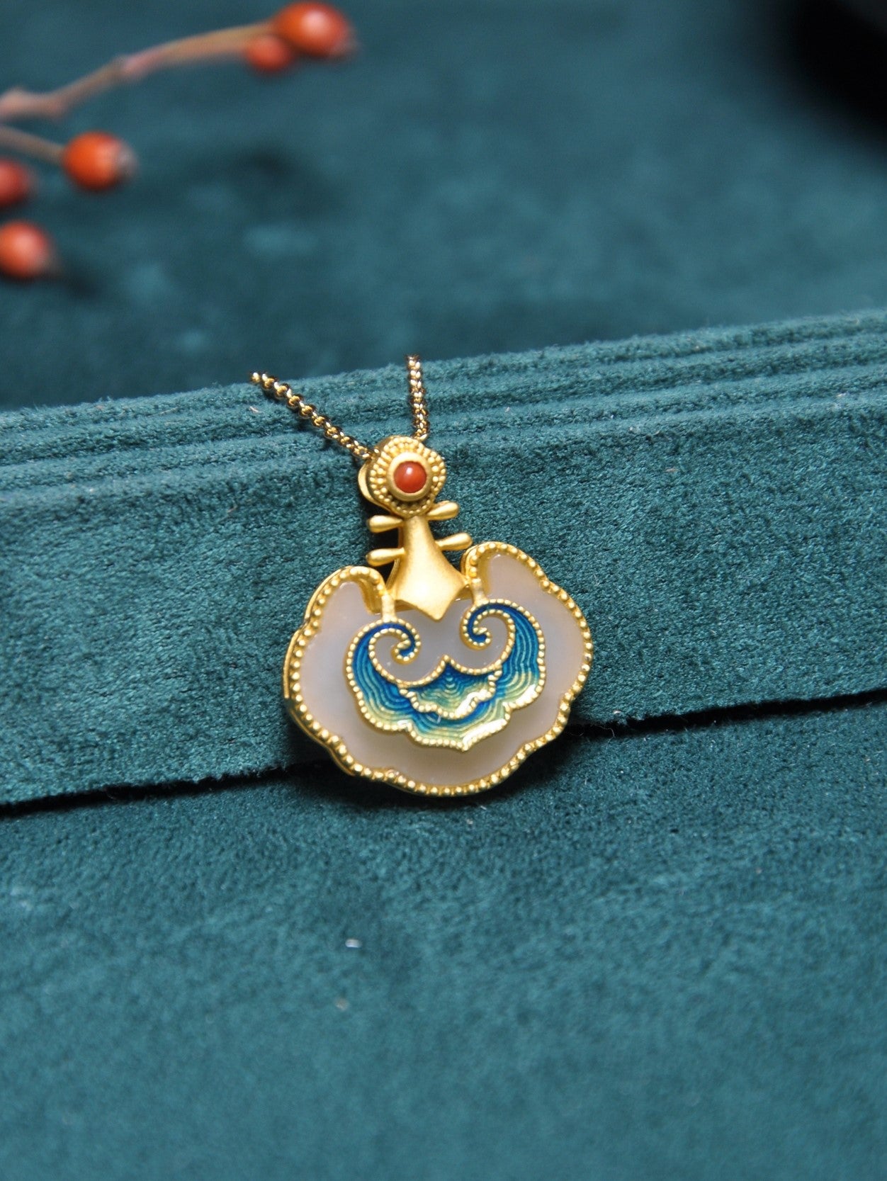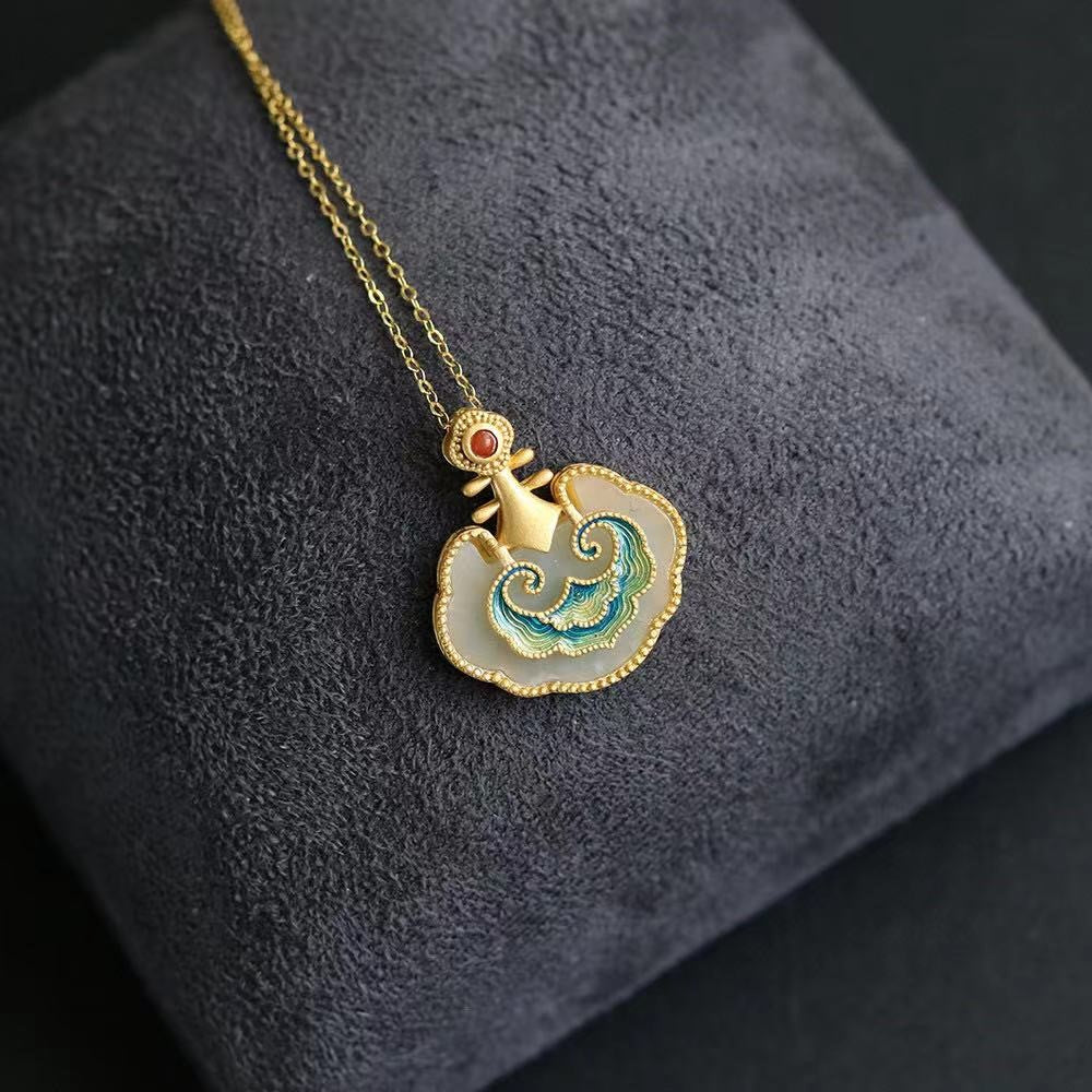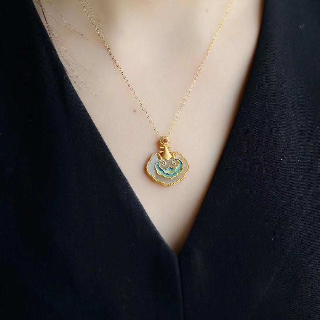 Enamel work is a technique that involves fusing colored powdered glass onto a metal surface through high heat. In this pendant, the enamel work is used to create intricate and vibrant patterns and colors. The enamel details enhance the overall visual appeal of the pendant and add depth and texture to the design. The combination of enamel work with the natural beauty of Hotan Jade creates a captivating contrast.