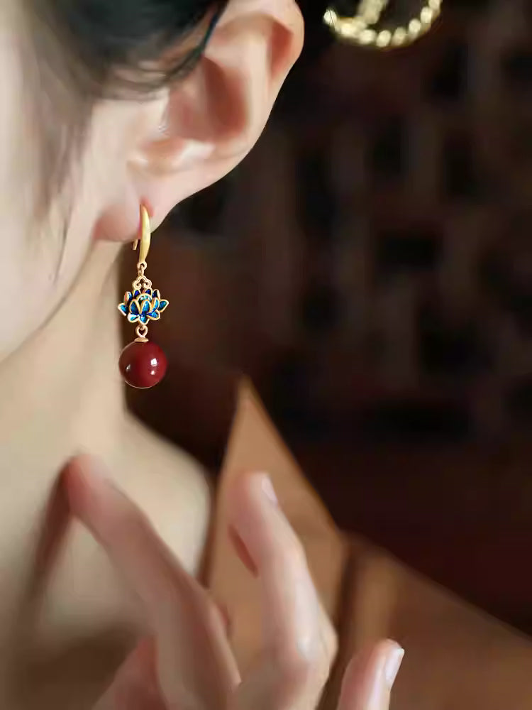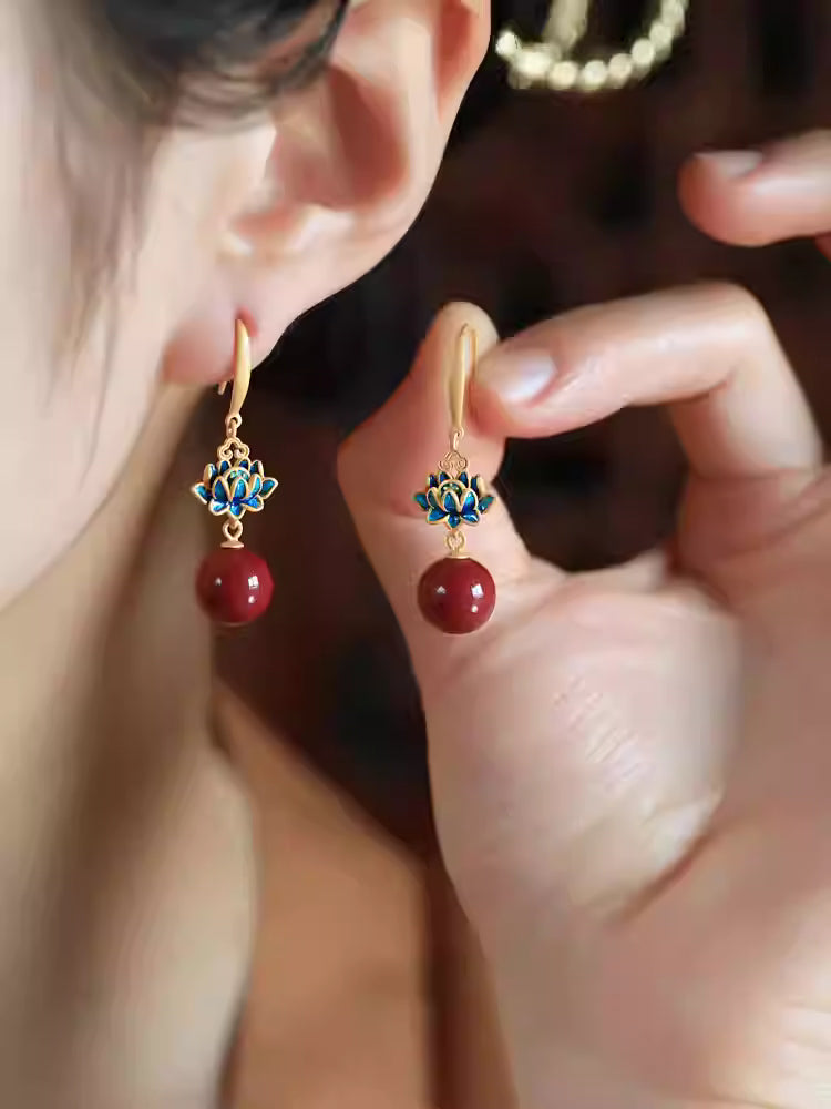 Red Cinnabar Lotus Earrings – Chinese Style Enamel Drop Earrings for Women | Feng Shui Lucky Jewelry