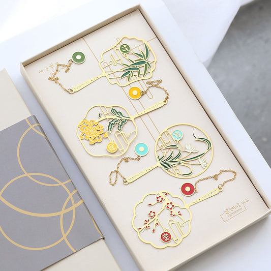 Chinoiserie Plum Orchid Bamboo Brass Lacquer Hollow Fringe Fan Bookmark Set