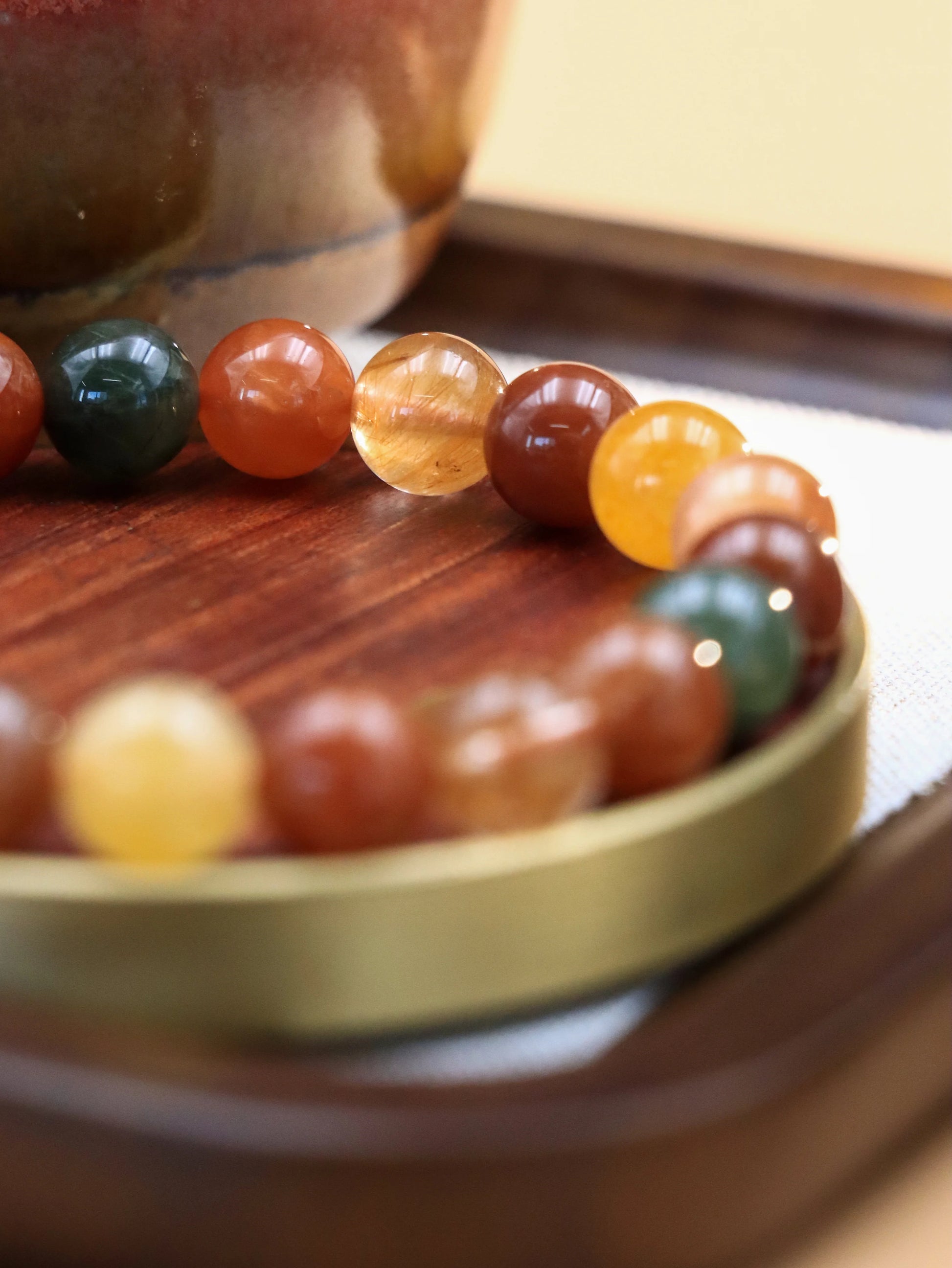 Red corresponds to the Fire element, bringing passion and transformative energy; yellow corresponds to the Earth element, offering stability and strengthening wealth luck; green corresponds to the Wood element, symbolizing vitality and growth. These three elements complement each other to create balanced energy, helping the wearer achieve harmony and improvement in life.