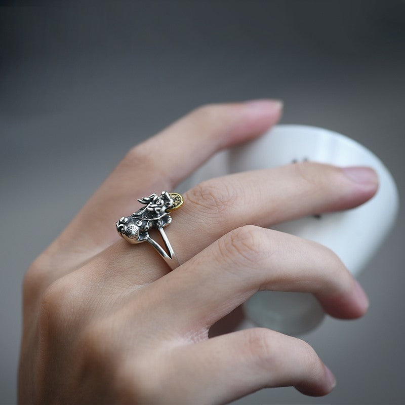 Pixiu Bite Copper Coin Ring-Sterling silver