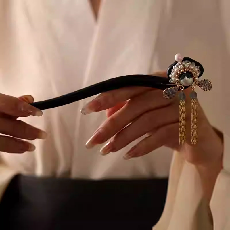 Inspired by the Peking Opera Daomadan role, this hairpin reflects the artistry of traditional Chinese theatre. The blackwood base provides strength and elegance, while pearl accents and flowing tassels highlight the delicate beauty of classical femininity. Each piece is handcrafted to preserve its cultural richness and aesthetic refinement.