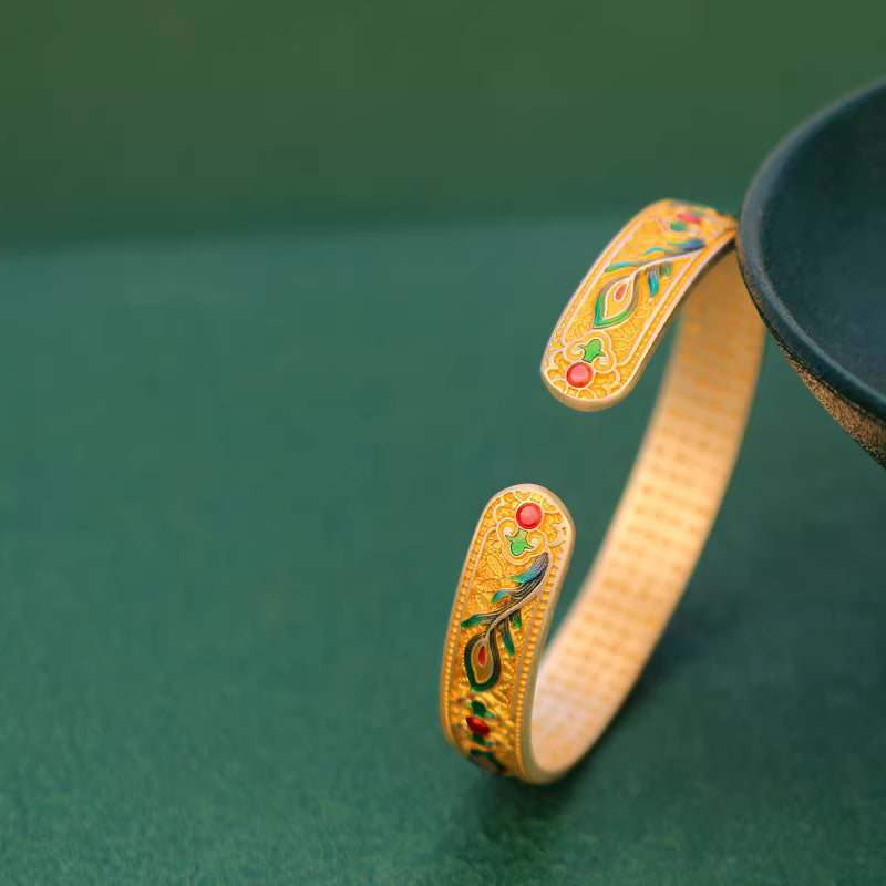 9999 Fine Silver Enamel Phoenix Feather Heart Sutra Bangle – Adjustable Solid Silver Bracelet for Women