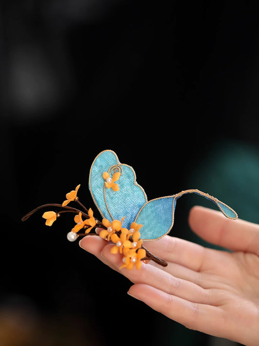 Handcrafted Fabric Butterfly Osmanthus Brooch – Vintage Qipao Chest Pin with Pearl Accent for Women