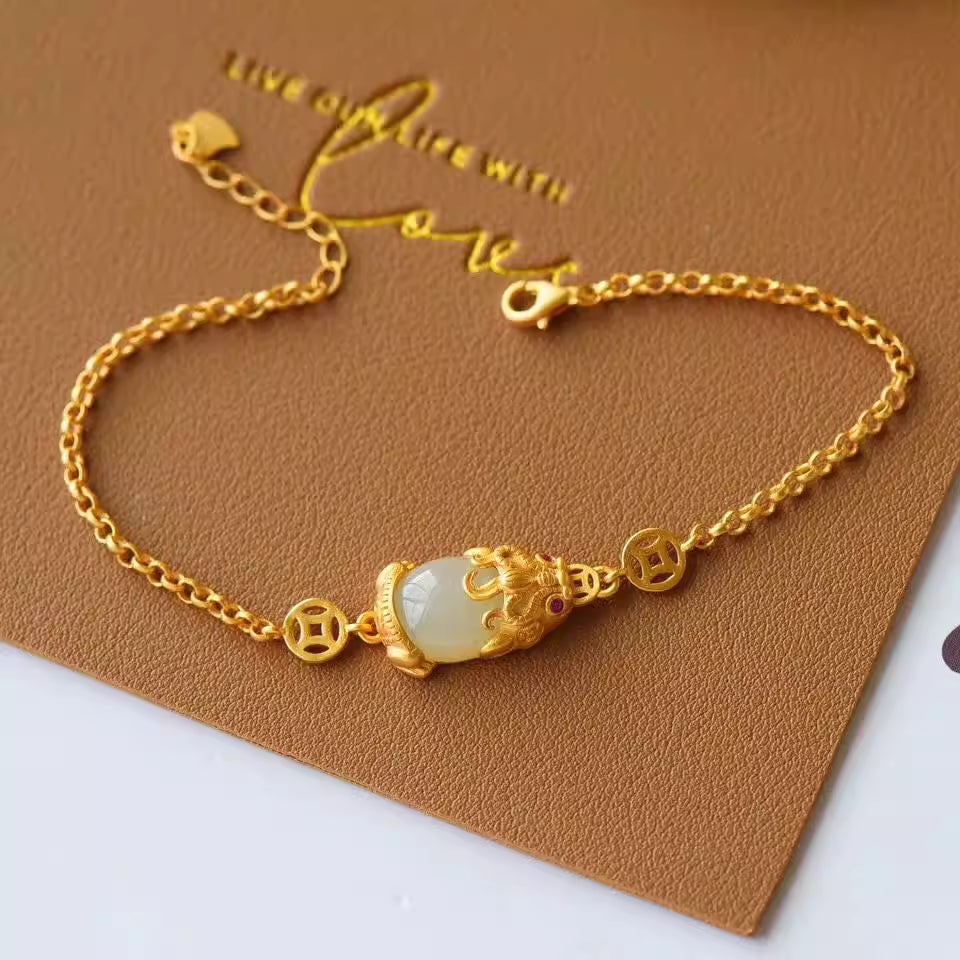 This exquisite Pi Xiu bracelet combines S925 gold-plated silver and natural Hetian jade, embodying classical Chinese aesthetics with a touch of modern elegance. Designed to attract wealth, promote good fortune, and elevate everyday style, it is a versatile accessory for women seeking meaningful and refined jewelry.