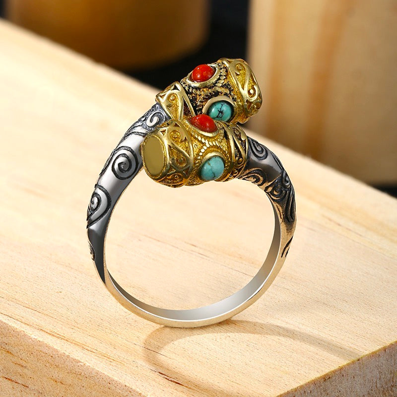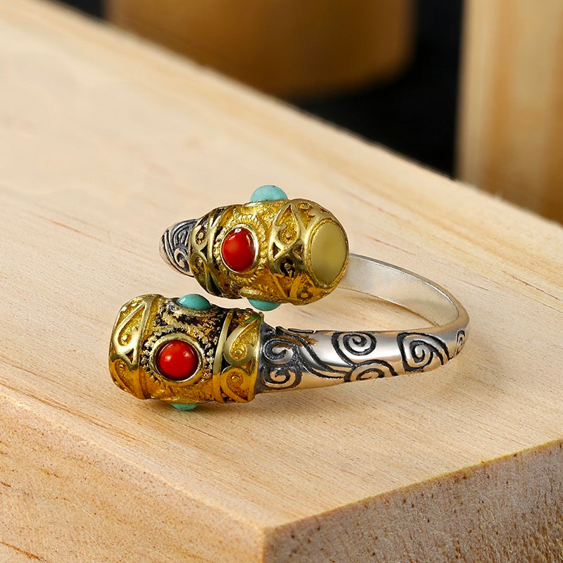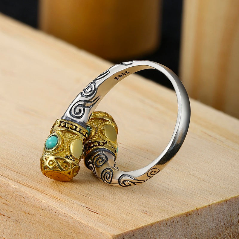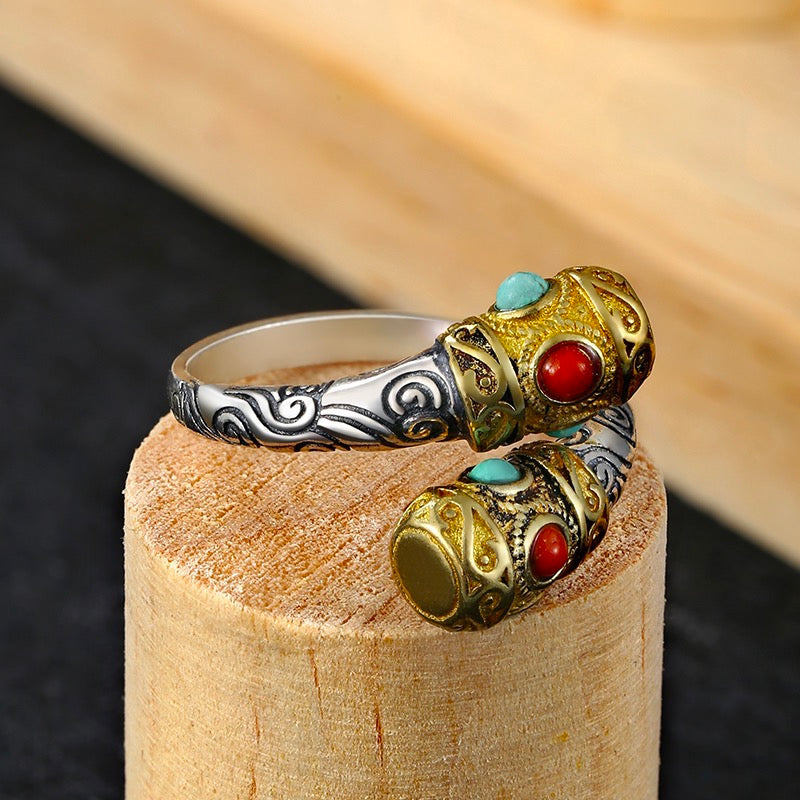 Ruyi Golden Hoop Stick Turquoise Ruby Ring - Sterling Silver