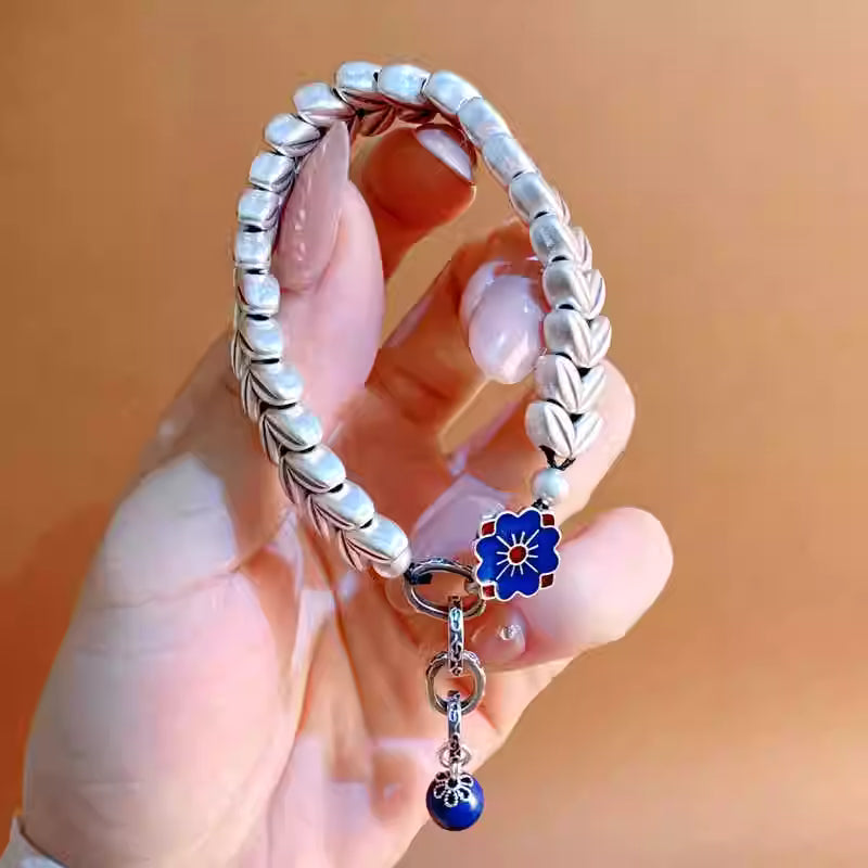This sterling silver Wheat Motif Bracelet combines elegance, tradition, and symbolism. Featuring natural Lapis Lazuli beads and a handcrafted wheat design, this bracelet is made using ancient Chinese silver techniques.