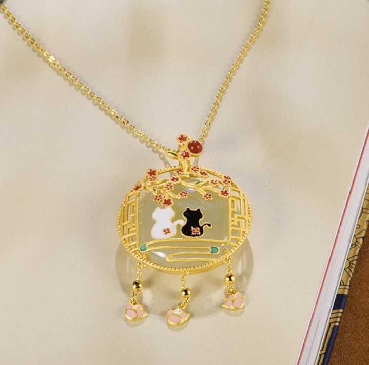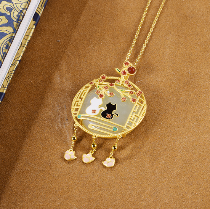 Hetian Jade: Hetian jade, also known as nephrite jade, is a precious gemstone highly revered in Chinese culture. It is renowned for its lustrous texture, smoothness, and various shades of green. In this pendant, the Hetian jade is carved into the shape of a black and white cat, symbolizing playfulness, independence, and good luck.