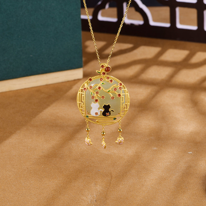 Hetian jade black and white cat plum blossom red agate tassel pendant